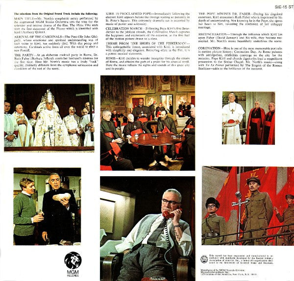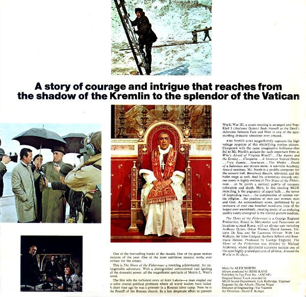 A1. Overture 3:59 A2. Arrival Of The Cardinals 2:45 A3. The Election 2:25 A4. Veni Creatore Spiritus 2:30 A5. Kiril Is Procaimed Pope 3:32 A6. Kiril's Loneliness 2:05 A7. Celebration 1:38 B1. Theme From "The Shoes Of The Fisherman" 1:55 B2. Rome 1:57 B3. The Pope Advises Dr. Faber 3:33 B4. Reconciliation 2:28 B5. The Gathering 2:13 B6. Coronation 4:23