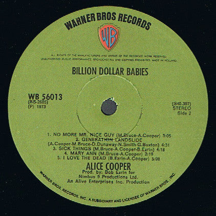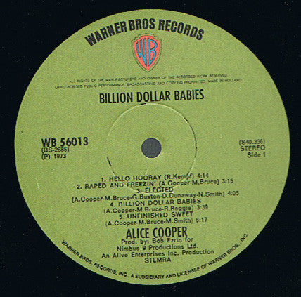 A1. Hello Hooray 4:14 A2. Raped And Freezin' 3:15 A3. Elected 4:05 A4. Billion Dollar Babies 3:39 A5. Unfinished Sweet 6:17 B1. No More Mr. Nice Guy 3:05 B2. Generation Landslide 4:34 B3. Sick Things 4:18 B4. Mary Ann 2:19 B5. I Love The Dead 5:08