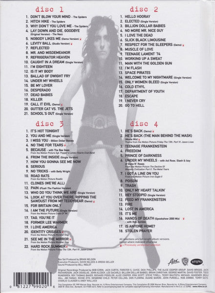 1-1. Spiders - Don't Blow Your Mind 2:361-2. Spiders - Hitch Hike 2:011-3. Spiders - Why Don't You Love Me 1:571-4. The Nazz - Lay Down And Die, Goodbye (Original Version) 2:071-5. Alice Cooper - Nobody Likes Me (Demo Version) 3:231-6. Alice Cooper - Levity Ball (Studio Version) 4:451-7. Alice Cooper - Reflected 3:141-8. Alice Cooper - Mr. And Misdemeanor 3:001-9. Alice Cooper - Refrigerator Heaven 1:541-10. Alice Cooper - Caught In A Dream (Single Version) 2:551-11. Alice Cooper - I'm Eighteen 2:581-12. Alice Cooper - Is It My Body 2:391-13. Alice Cooper - Ballad Of Dwight Fry 6:341-14. Alice Cooper - Under My Wheels 2:471-15. Alice Cooper - Be My Lover 3:211-16. Alice Cooper - Desperado 3:291-17. Alice Cooper - Dead Babies 5:421-18. Alice Cooper - Killer 7:051-19. Alice Cooper - Call It Evil (Demo) 3:281-20. Alice Cooper - Gutter Cat Vs. The Jets 4:391-21. Alice Cooper - School's Out (Single Version) 3:312-1. Alice Cooper - Hello Hooray 4:152-2. Alice Cooper - Elected (Single Version) 3:432-3. Alice Cooper - Billion Dollar Babies 3:392-4. Alice Cooper - No More Mr. Nice Guy 3:072-5. Alice Cooper - I Love The Dead 5:072-6. Alice Cooper - Slick Black Limousine 4:202-7. Alice Cooper - Respect For The Sleepers (Demo) 3:482-8. Alice Cooper - Muscle Of Love 3:452-9. Alice Cooper - Teenage Lament '74 3:522-10. Alice Cooper - Working Up A Sweat 3:312-11. Alice Cooper - Man With The Golden Gun 4:092-12. Alice Cooper (2) - I'm Flash 3:112-13. Alice Cooper (2) - Space Pirates 3:132-14. Alice Cooper (2) - Welcome To My Nightmare (Single Version) 2:472-15. Alice Cooper (2) - Only Women Bleed (Single Version) 3:302-16. Alice Cooper (2) - Cold Ethyl 2:542-17. Alice Cooper (2) - Department Of Youth 3:172-18. Alice Cooper (2) - Escape 3:142-19. Alice Cooper (2) - I Never Cry 3:432-20. Alice Cooper (2) - Go To Hell 5:123-1. Alice Cooper (2) - It's Hot Tonight 3:213-2. Alice Cooper (2) - You And Me (Single Version) 3:253-3. Billion Dollar Babies - I Miss You 3:313-4. Alice Cooper (2) - No Time For Tears 2:593-5. Alice Cooper (2) - Because 2:453-6. Alice Cooper (2) - From The Inside (Single Version) 3:303-7. Alice Cooper (2) - How You Gonna See Me Now 3:533-8. Alice Cooper (2) - Serious 2:413-9. Alice Cooper (2) - No Tricks 4:153-10. Alice Cooper (2) - Road Rats 2:433-11. Alice Cooper (2) - Clones (We're All) 2:513-12. Alice Cooper (2) - Pain (Flush The Fashion Version) 4:103-13. Alice Cooper (2) - Who Do You Think We Are (Single Version) 3:053-14. Alice Cooper (2) - Look At You Over There, Ripping The Sawdust From My Teddybear (Demo) 3:183-15. Alice Cooper (2) - For Britain Only 3:023-16. Alice Cooper (2) - I Am The Future (Single Version) 3:453-17. Alice Cooper (2) - Tag, You're It 2:523-18. Alice Cooper (2) - Former Lee Warmer 4:073-19. Alice Cooper (2) - I Love America 3:473-20. Alice Cooper (2) - Identity Crisises 2:503-21. Alice Cooper (2) - See Me In The Mirror 3:123-22. Alice Cooper (2) - Hard Rock Summer 2:314-1. Alice Cooper (2) - He's Back (Demo) 3:204-2. Alice Cooper (2) - He's Back (The Man Behind The Mask) (Movie Mix) 3:444-3. Alice Cooper (2) - Teenage Frankenstein 3:324-4. Alice Cooper (2) - Freedom 4:044-5. Alice Cooper (2) - Prince Of Darkness 5:094-6. Alice Cooper (2) - Under My Wheels 3:104-7. Alice Cooper (2) - I Got A Line On You 2:594-8. Alice Cooper (2) - Poison 4:274-9. Alice Cooper (2) - Trash 3:584-10. Alice Cooper (2) - Only My Heart Talkin' 4:444-11. Alice Cooper (2) - Hey Stoopid (Single Version) 4:154-12. Alice Cooper (2) - Feed My Frankenstein 4:424-13. Alice Cooper (2) - Fire 3:004-14. Alice Cooper (2) - Lost In America 3:544-15. Alice Cooper (2) - It's Me 4:404-16. Alice Cooper (2) - Hands Of Death (Spookshow 2000 Mix) 3:534-17. Alice Cooper (2) - Is Anyone Home? 4:104-18. Alice Cooper (2) - Stolen Prayer 5:35