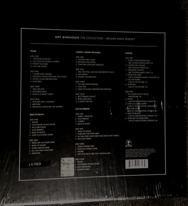 A1. Stronger Than Me A2. You Sent Me Flying (Cherry) A3. Know You Now A4. Fuck Me Pumps B1. I Heard Love Is Blind B2. Moody's Mood For Love (Teo Licks) B3. (There Is) No Greater Love B4. In My Bed C1. Take The Box C2. October Song C3. What Is It About Men? D1. Amy Amy Amy / (Outro) D2. Brother D3. Mr Magic (Through The Smoke) . Back To Black E1. Rehab E2. You Know I'm No Good E3. Me & Mr Jones E4. Just Friends E5. Back To Black E6. Love Is A Losing Game F1. Tears Dry On Their Own F2. Wake Up Alone F3. Some Unholy War F4. He Can Only Hold Her F5. Addicted . Lioness: Hidden Treasures G1. Our Day Will Come G2. Between The Cheats G3. Tears Dry (Original Version) H1. Will You Still Love Me Tomorrow? (2011) H2. Like Smoke H3. Valerie ('68 Version) I1. The Girl From Ipanema I2. Half Time I3. Wake Up Alone (Original Recording) J1. Best Friends, Right? J2. Body And Soul J3. A Song For You . Live In London K1. Intro / Addicted K2. Just Friends K3. Cherry K4. Back To Black L1. Wake Up Alone L2. Tears Dry On Their Own L3. He Can Only Hold Her / Doo Wop (That Thing) L4. Fuck Me Pumps M1. Some Unholy War M2. Love Is A Losing Game M3. Valerie M4. Hey Little Rich Girl N1 . Rehab N2. You Know I'm No Good N3. Me & Mr Jones N4. Monkey Man . Rarities O1. (There Is) No Greater Love (BBC Session Janice Long '03) O2. I Heard Love Is Blind (BBC Session Stables '04) O3. Stronger Than Me (BBC Session Janice Long '03) O4. Know You Now (Live At Summer Sundae, Leicester '04) O5. Fuck Me Pumps (Live At T In The Park '04) O6. In My Bed (Live At T In The Park '04) P1. You Know I'm No Good (NapsterLive '06) P2. Rehab (Live On Pete Mitchell's Show '06) P3. Love Is A Losing Game (Live At iTunes Festival London '06) P4. Me & Mr Jones (Live At iTunes Festival London '06) P5. Back To Black (Live At iTunes Festival London '06) P6. Tears Dry On Their Own (Live At iTunes Festival London '06)