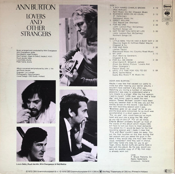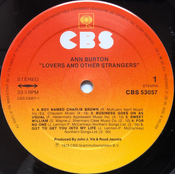 A1. A Boy Named Charlie Brown 4:19 A2. Business Goes On As Usual 3:13 A3. Sweet William 2:10 A4. For No One 3:36 A5. Got To Get You Into My Life 3:00 B1. Little Man You've Had A Busy Day 2:39 B2. Fire And Rain 2:50 B3. My Ship 3:13 B4. For All We Know 2:39 B5. Until It's Time For You To Go 5:08