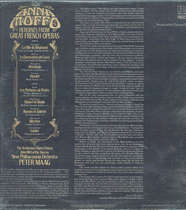 A1. Chacun Le Sait, Chacun Le Dit (From "La Fille Du Régiment") A2. D'Amour L'Ardente Flamme (From "La Damnation De Faust") A3. Il Est Doux, Il Est Bon (From "Hérodiade") A4. Mad Scene (From "Hamlet" B1. O Dieu Brahma (From "Les Pêcheurs De Perles") B2. Robert, Toi Que J'aime (From "Robert Le Diable") B3. Je Veux Vivre (From "Roméo Et Juliette") B4. Letter Scene (From "Werther") B5. Depuis Le Jour (From "Louise")
