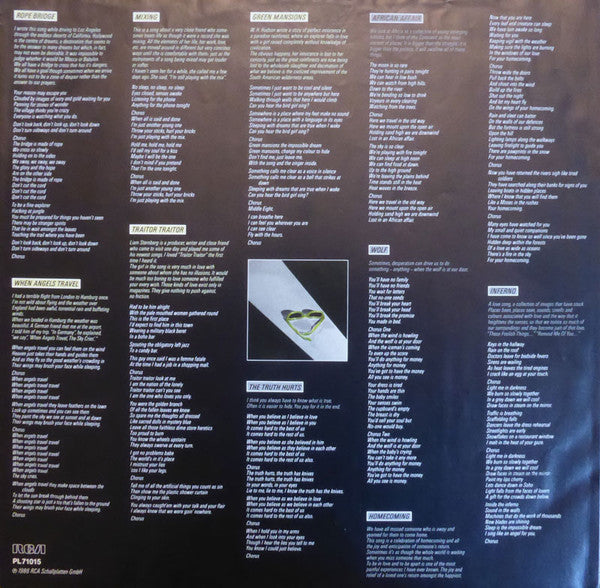 A1. Rope Bridge 3:40 A2. When Angels Travel 4:29 A3. Mixing 4:45 A4. Traitor Traitor 3:48 A5. Green Mansions 4:31 B1. The Truth Hurts 4:03 B2. African Affair 3:52 B3. Wolf 4:37 B4. Homecoming 3:19 B5. Inferno 4:58