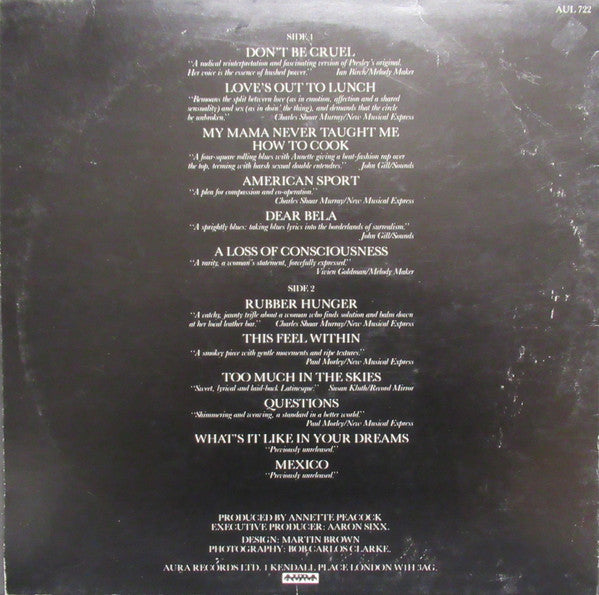 A1. Don't Be Cruel A2. Love's Out To Lunch A3. My Mama Never Taught Me How To Cook A4. American Sport A5. Dear Bela A6. A Loss Of Consciousness B1. Rubber Hunger B2. This Feel Within B3. Too Much In The Skies B4. Questions B5. What's It Like In Your Dreams B6. Mexico