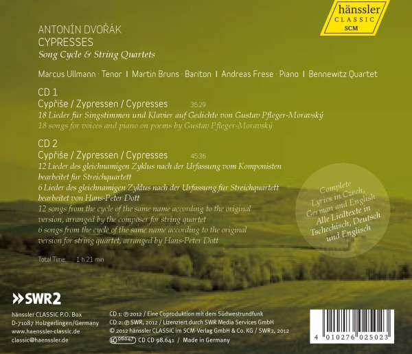 CD-1. Cypřiše / Zypressen / Cypresses (18 Lieder Für Singstimmen Und Klavier Auf Gedichte Von Gustav Pfleger-Moravský = 18 Songs For Voices And Piano On Poems By Gustav Pfleger-Moravský) 35:29CD-2. Cypřiše / Zypressen / Cypresses (12 Lieder Des Gleichnamigen Zyklus Nach Der Urfassung Vom Komponisten Bearbeitet Für Streichquartett / 6 Lieder Des Gleichnamigen Zyklus Nach Der Urfassung Für Streichquartett Bearbeitet Von Hans-Peter Dott = 12 Songs From The Cycle Of The Same Name According To The Original Version, Arranged By The Composer For String Quartet / 6 Songs From The Cycle Of The Same Name According To The Original Version For String Quartet, Arranged By Hans-Peter Dott) 45:36