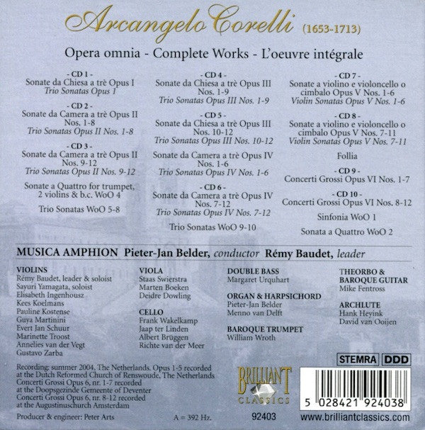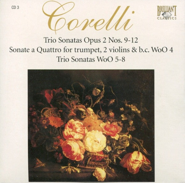 . Sonate Da Chiesa A Trè, Opus I (Rome, 1681) - Dedicated To Christina Of Sweden . Sonata 1 In F Major . Sonata 2 In E Minor . Sonata 3 In A Major . Sonata 4 In A Minor . Sonata 5 In B Flat Major . Sonata 6 In B Minor . Sonata 7 In C Major . Sonata 8 In C Minor . Sonata 9 In G Major . Sonata 10 In G Minor . Sonata 11 In D Minor . Sonata 12 In D Major . Sonate Da Camera A Trè, Opus II (Rome, 1685) - Dedicated To Cardinal Benedetto Pamphili . Sonata 1 In D Major . Sonata 2 In D Minor . Sonata 3 In C Major . Sonata 4 In E Minor . Sonata 5 In B Flat Major . Sonata 6 In G Minor . Sonata 7 In F Major . Sonata 8 In B Minor . Sonata 9 In F Sharp Minor . Sonata 10 In E Major . Sonata 11 In E Flat Major . Sonata 12 In G Major . Sonata A Quattro In D Major (WoO4) - Tromba Sola, Due Violini E Basso . Sonate Postume A Due Violini E Violoncello Col Basso Per L'Organo (Amsterdam, 1714) . Sonata A Tre In A Major (WoO5) . Sonata A Tre In D Major (WoO6) . Sonata A Tre In D Major (WoO7) . Sonata A Tre In D Major (WoO8) . Sonata Da Chiesa A Trè, Opus III (Rome, 1689) - Dedicated To Duke Francesco II Of Modena . Sonata 1 In F Major . Sonata 2 In D Major . Sonata 3 In B-Flat Major . Sonata 4 In B Minor . Sonata 5 In D Minor . Sonata 6 In G Major . Sonata 7 In E Minor . Sonata 8 In C Major . Sonata 9 In F Minor . Sonata 10 In A Minor . Sonata 11 In G Minor . Sonata 12 In A Major . Sonate Da Camera A Trè, Opus IV (Rome, 1694) - Dedicated To Cardinal Pietro Ottoboni . Sonata No.1 In C Major . Sonata 2 In G Minor . Sonata 3 In A Major . Sonata 4 In D Major . Sonata 5 In A Minor . Sonata 6 In E Major . Sonate Da Camera A Trè, Opus IV (Rome, 1694) - Dedicated To Cardinal Pietro Ottoboni . Sonata 7 In F Major . Sonata 8 In D Minor . Sonata 9 In B Flat Major . Sonata 10 In G Major . Sonata 11 In C Minor . Sonata 12 In B Minor . Sonate Postume A Due Violini E Violoncello Col Basso Per L'Organo (Amsterdam, 1714) . Sonata A Tre In G Minor (WoO 9) . Sonata A Tre In G Minor (WoO 10) . Sonate A Violino E Violoncello O Cimbalo Opus V (Rome, 1700) - Dedicated To Electress Sophie Charlotte Of Brandenburg . Sonata 1 In D Major . Sonata 2 In B Flat Major . Sonata 3 In C Major . Sonata 4 In F Major . Sonata 5 In G Minor . Sonata 6 In A Major . Part 2: Preludii, Allemande, Correnti, Gighe, Sarabande, Gavotte, E Folia . Sonata 7 In D Minor . Sonata 8 In D Minor . Sonata 9 In A Major . Sonata 10 In F Major . Sonata 11 In E Major 8-23. Follia 10:57. 12 Concerti Grossi Opus VI - Concerti Grossi, Con Duoi Violini E Violoncello Di Concertino Obligati E Duoi Altri Violini, Viola E Basso Di Concerto Grosso Ad Arbotrio Che Si Potranno Radoppiare . Concerto 1 In D Major . Concerto 2 In F Major . Concerto 3 In C Minor . Concerto 4 In D Major . Concerto 5 In B Flat Major . Concerto 5 In F Major . Concerto 6 In D Major . Concerto 8 In G Minor: Fatto Per La Notte Di Natale (Christmas Concerto) . Parte Seconda Per Camera - Preludii, Allemande, Correnti, Gighe, Sarabande, Gavotte E Minuetti . Concerto No.9 In F . Concerto 10 In C Major . Concerto 11 In B Flat Major . Concerto 12 In F Major . Sinfonia (WoO 1) (To The Oratorio Santa Beatrice D'Este) . Sonata A Quattro (WoO 2)