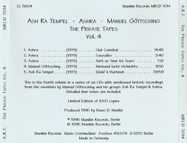 This is the fourth volume in a series of six CDs with unreleased historic recordings from the seventies by Manuel Göttsching and his groups Ash Ra Tempel & Ashra.
