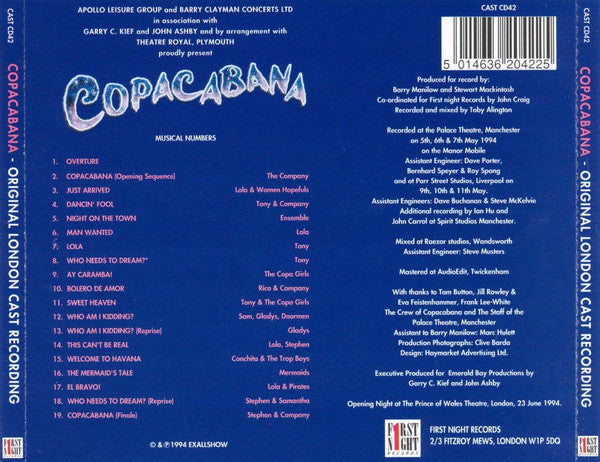 1. Overture 2. Copacabana 3. Just Arrived 4. Dancin' Fool 5. Night On The Town 6. Man Wanted 7. Lola 8. Who Needs To Dream? 9. Ay Caramba! 10. Bolero De Amor 11. Sweet Heaven 12. Who Am I Kidding? 13. Who Am I Kidding? (Reprise) 14. This Can't Be Real 15. Welcome To Havana 16. The Mermaid's Tale 17. El Bravo! 18. Who Needs To Dream? (Reprise) 19. Copacabana (Finale)