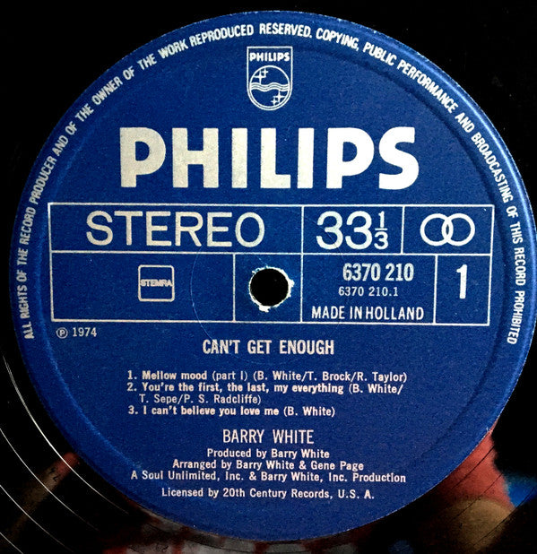 On back cover: A Soul Unlimited Inc. & Barry White, Inc. Production Licensed by 20th Century Records U.S.A. On labels: Made In Holland ℗ 1974 A Soul Unlimited, Inc. & Barry White, Inc. Production Licensed by 20th Century Records, U.S.A.