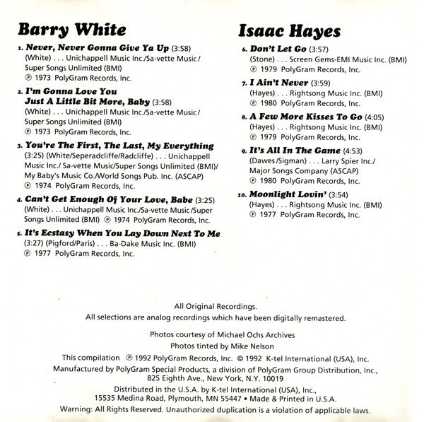 . Barry White 1. Barry White - Never, Never Gonna Give You Up 4:032. Barry White - I'm Gonna Love You Just A Little Bit More, Baby 3:583. Barry White - You're The First, The Last, My Everything 3:244. Barry White - Can't Get Enough Of Your Love, Babe 3:255. Barry White - It's Ecstasy When You Lay Down Next To Me 3:27. Isaac Hayes 6. Isaac Hayes - Don't Let Go 3:587. Isaac Hayes - I Ain't Never 3:578. Isaac Hayes - A Few More Kisses To Go 3:599. Isaac Hayes - It's All In The Game 4:5310. Isaac Hayes - Moonlight Lovin' 3:53