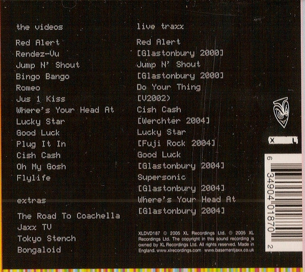 . The Videos 49:391.01. Red Alert 3:561.02. Rendez-Vu 3:431.03. Jump 'N Shout 3:521.04. Bingo Bango 3:411.05. Romeo 3:281.06. Jus 1 Kiss 4:441.07. Where's Your Head At 4:111.08. Lucky Star 3:121.09. Good Luck 4:011.10. Plug It In 4:041.11. Cish Cash 3:301.12. Oh My Gosh 3:071.13. Flylife 4:04. Live Traxx 45:132.01. Red Alert (Glastonbury 2000) 8:192.02. Jump N' Shout (Glastonbury 2000) 5:442.03. Do Your Thing (V2002) 5:072.04. Cish Cash (Werchter 2004) 4:232.05. Lucky Star (Fuji Rock 2004) 4:512.06. Good Luck (Glastonbury 2004) 4:342.07. Supersonic (Glastonbury 2004) 4:122.08. Where's Your Head At (Glastonbury 2004) 7:252.09. Credits 0:32. Extras 48:013.01. The Road To Coachella 29:293.02. Jaxx TV 10:493.03. Tokyo Stench 3:263.04. Bongaloid 4:17