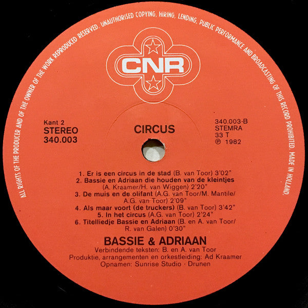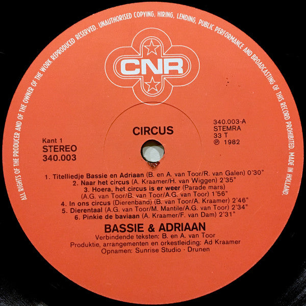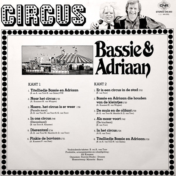 A1. Titelliedje Bassie En Adriaan 0:30 A2. Naar Het Circus 2:35 A3. Hoera, Het Circus Is Er Weer (Parade Mars) 1:56 A4. In Ons Circus (Dierenband) 2:46 A5. Dierentaal 2:34 A6. Pinkie De Baviaan 2:31 B1. Er Is Een Circus In De Stad 3:02 B2. Bassie En Adriaan Die Houden Van De Kleintjes 2:20 B3. De Muis En De Olifant 2:09 B4. Als Maar Voort (De Truckers) 3:42 B5. In Het Circus 2:24 B6. Titelliedje Bassie En Adriaan 0:30
