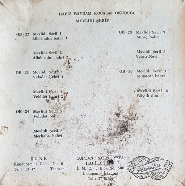 . Mevlidi Şerif 1 / Mevlidi Şerif 2 A. Allah Adin Bahri 1 B. Allah Adin Bahri 2 . Mevlidi Şerif 3 / Mevlidi Şerif 4 A. Velâdet Bahri 1 B. Velâdet Bahri 2 . Mevlidi Şerif 5 / Mevlidi Şerif 6 A. Velâdet Bahri 3 B. Velâdet Bahri 4 . Mevlidi Şerif 7 / Mevlidi Şerif 8 A. Mirac Bahri B. Vefat'i Nebi . Mevlidi Şerif 9 / Mevlidi Şerif 10 A. Münacat Bahri B. Büyük Dua