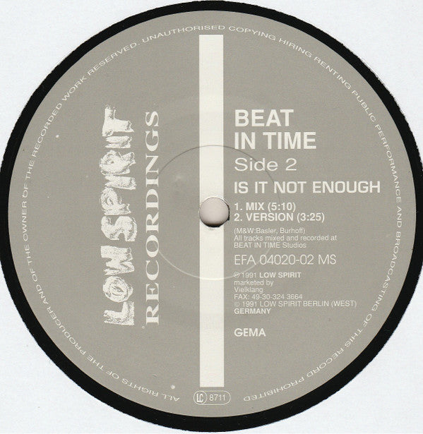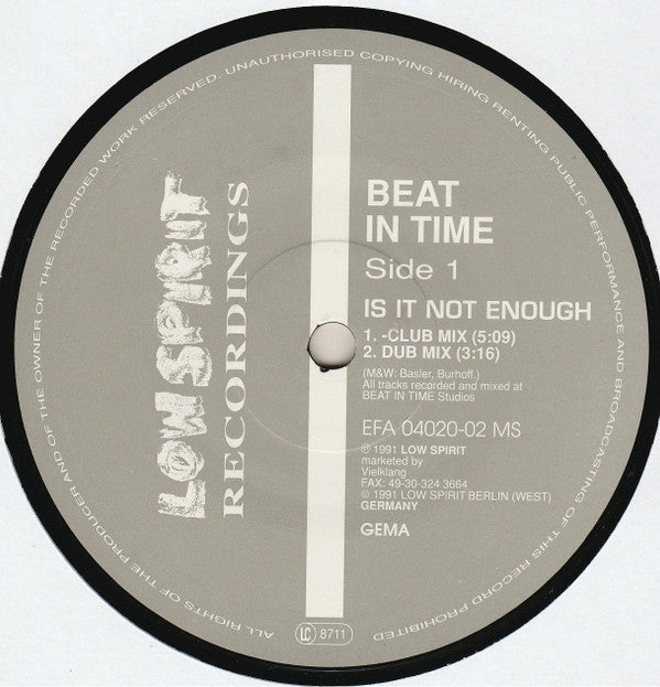 A1. Is It Not Enough (Club Mix) 5:09 A2. Is It Not Enough (Dub Mix) 3:16 B1. Is It Not Enough (Mix) 5:10 B2. Is It Not Enough (Version) 3:25