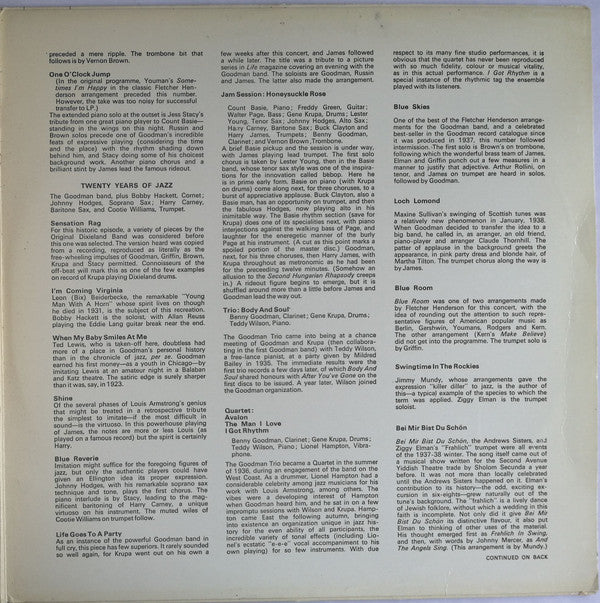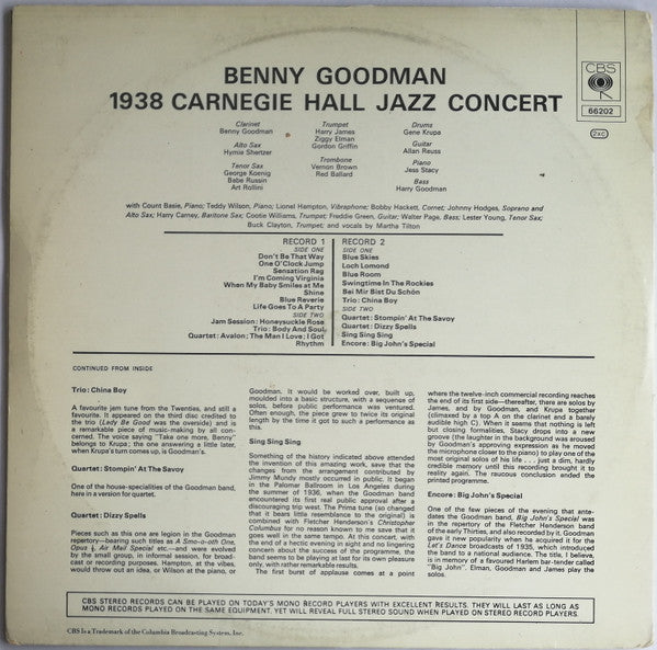 A1. Don't Be That Way A2. One O'Clock Jump A3. Sensation Rag A4. I'm Coming Virginia A5. When Baby Smiles At Me A6. Shine A7. Blue Reverie A8. Life Goes To A Party B1. Jam Session: Honeysuckle Rose B2. Trio: Body And Soul B3. Quartet: Avalon B4. Quartet: The Man I Love B5. Quartet: I Got Rhythm . Volume 2 C1. Blue Skies C2. Loch Lomond C3. Blue Room C4. Swingtime In The Rockies C5. Bei Mir Bist Du Schön C6. Trio: China Boy D1. Quartet: Stompin' At The Savoy D2. Quartet: Dizzy Spells D3. Sing Sing Sing D4. Encore: Big John's Special