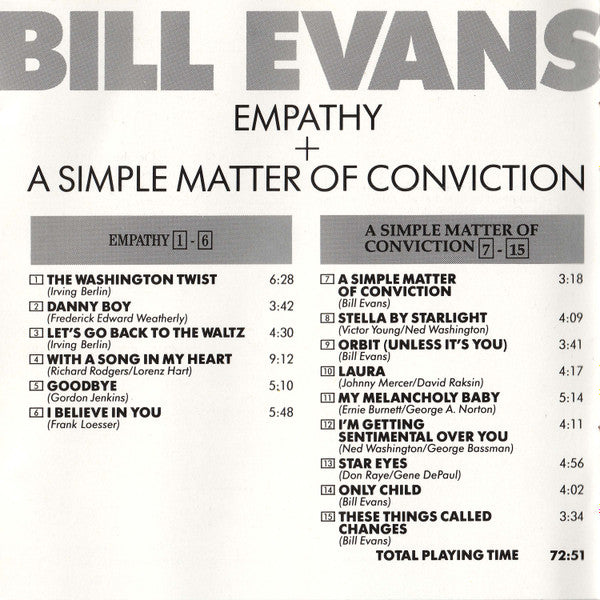 . Empathy 1. The Washington Twist 6:282. Danny Boy 3:423. Let's Go Back To The Waltz 4:304. With A Song In My Heart 9:125. Goodbye 5:106. I Believe In You 5:48. A Simple Matter Of Conviction 7. A Simple Matter Of Conviction 3:188. Stella By Starlight 4:099. Orbit (Unless It's You) 3:4110. Laura 4:1711. My Melancholy Baby 5:1412. I'm Getting Sentimental Over You 4:1113. Star Eyes 4:5614. Only Child 4:0215. These Things Called Changes 3:34