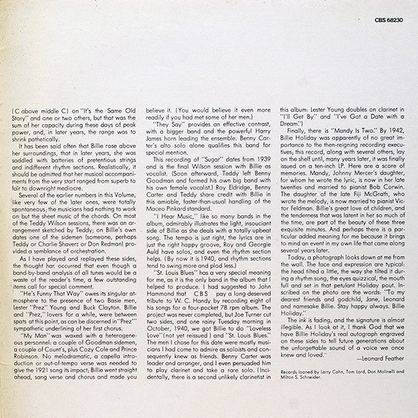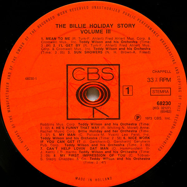 A1. Teddy Wilson And His Orchestra - Mean To Me A2. Teddy Wilson And His Orchestra - I'll Get By A3. Teddy Wilson And His Orchestra - Sun Showers A4. Billie Holiday And Her Orchestra - He's Funny That Way A5. Teddy Wilson And His Orchestra - My Man A6. Teddy Wilson And His Orchestra - Nice Work If You Can Get It A7. Teddy Wilson And His Orchestra - Can't Help Lovin' Dat Man A8. Teddy Wilson And His Orchestra - My First Impression Of You B1. Teddy Wilson And His Orchestra - I Can't Believe That You're In Love With Me B2. Billie Holiday And Her Orchestra - Now They Call It Swing B3. Billie Holiday And Her Orchestra - If I Were You B4. Billie Holiday And Her Orchestra - You Can't Be Mine B5. Billie Holiday And Her Orchestra - I've Got A Date With A Dream B6. Billie Holiday And Her Orchestra - I'm Gonna Lock My Heart And Throw Away The Key B7. Teddy Wilson And His Orchestra - They Say B8. Teddy Wilson And His Orchestra - Say It With A Kiss C1. Teddy Wilson And His Orchestra - Sugar C2. Teddy Wilson And His Orchestra - More Than You Know C3. Billie Holiday And Her Orchestra - Why Did I Always Depend On You C4. Billie Holiday And Her Orchestra - Night And Day C5. Billie Holiday And Her Orchestra - You're A Lucky Guy C6. Billie Holiday And Her Orchestra - Falling In Love Again C7. Billie Holiday And Her Orchestra - I'm All For You C8. Billie Holiday And Her Orchestra - I Hear Music D1. Billie Holiday And Her Orchestra - Practice Makes Perfect D2. Billie Holiday And Her Orchestra - It's The Same Old Story D3. Billie Holiday And Her Orchestra - St. Louis Blues D4. Billie Holiday And Her Orchestra - Solitude D5. Billie Holiday And Her Orchestra - I'm In A Lowdown Groove D6. Billie Holiday And Her Orchestra - Let's Do It D7. Billie Holiday And Her Orchestra - Mandy Is Two D8. Billie Holiday And Her Orchestra - It's A Sin To Tell A Lie