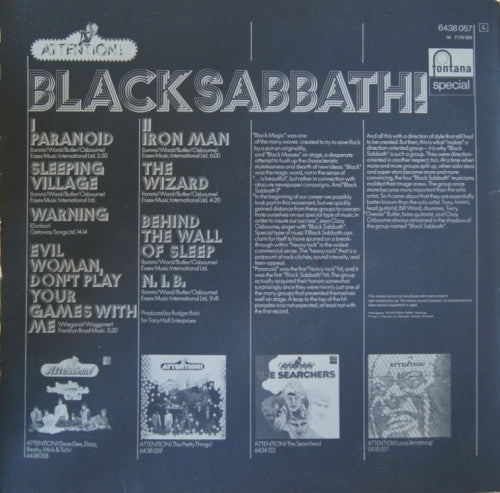 A1. Paranoid A2. Sleeping Village/Warning A3. Evil Woman, Don't Play Your Games With Me B1. Iron Man B2. The Wizard B3. Behind The Wall Of Sleep / N.I.B.