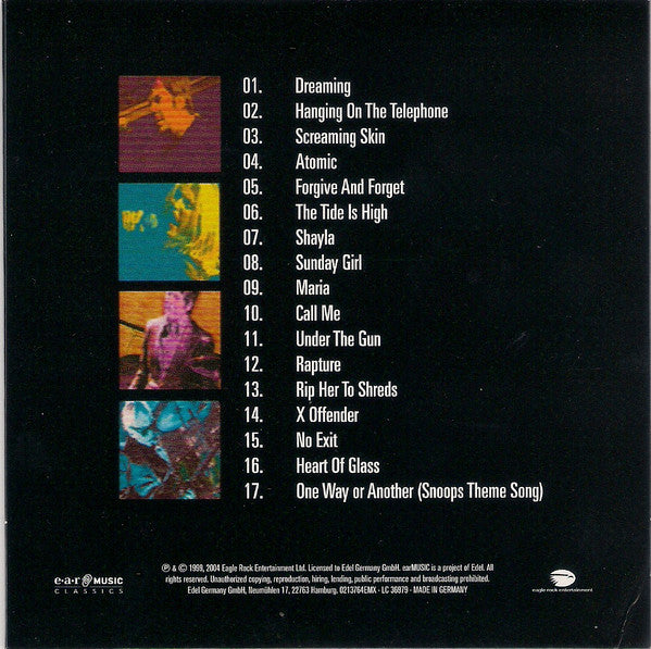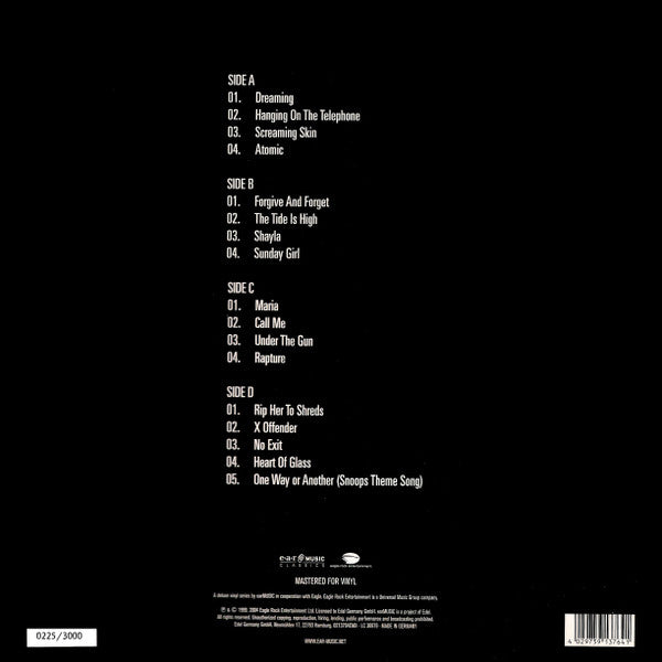 A1. Dreaming 3:27 A2. Hanging On The Telephone 2:23 A3. Screaming Skin 5:32 A4. Atomic 6:56 B1. Forgive And Forget 4:35 B2. The Tide Is High 4:04 B3. Shayla 5:08 B4. Sunday Girl 3:28 C1. Maria 4:49 C2. Call Me 4:46 C3. Under The Gun 4:54 C4. Rapture 6:24 D1. Rip Her To Shreds 3:20 D2. X Offender 3:24 D3. No Exit 4:08 D4. Heart Of Glass 4:52 D5. One Way Or Another ("Snoops" Theme Song) 3:38 CD-1. Dreaming 3:28 CD-2. Hanging On The Telephone 2:23 CD-3. Screaming Skin 5:33 CD-4. Atomic 6:56 CD-5. Forgive And Forget 4:35 CD-6. The Tide Is High 4:04 CD-7. Shayka 5:08 CD-8. Sunday Girl 3:29 CD-9. Maria 4:50 CD-10. Call Me 4:41 CD-11. Under The Gun 4:54 CD-12. Rapture 6:24 CD-13. Rip Her To Shreds 3:21 CD-14. X Offender 3:24 CD-15. No Exit 4:08 CD-16. Heart Of Glass 4:54 CD-17. One Way Or Another ("Snoops" Theme Song) 3:40