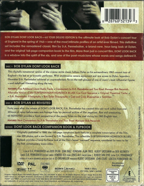 . Dont Look Back DVD1-1. Subterranean Homesick Blues 2:13DVD1-2. London Arrival 6:20DVD1-3. Who's This Donovan? 3:09DVD1-4. The Times They Are A-Changin' 11:52DVD1-5. I Just Go There And Sing 'Em 4:54DVD1-6. Turn, Turn, Turn 9:27DVD1-7. Denmark Street 5:59DVD1-8. Newcastle 2:10DVD1-9. The Science Student 7:55DVD1-10. The High Sheriff's Lady 1:32DVD1-11. I Don't Feel Like Singing 6:32DVD1-12. Who Threw The Glass? 3:38DVD1-13. Donovan 4:16DVD1-14. Royal Albert Hall 3:22DVD1-15. The Interview 6:12DVD1-16. The Last Concert 12:19. Bonus Audio Tracks Audio1. To Ramona 4:28Audio2. The Lonesome Death Of Hattie Carroll 6:48Audio3. Love Minus Zero / No Limit 5:21Audio4. It Ain't Me Babe 4:03Audio5. It's All Over Now, Baby Blue 7:43. Extras: DVD1-17. Film Trailer 2:12DVD1-18. "Subterranean Homesick Blues" Alternate Take 2:19. 65 Revisited DVD2-1. Arrive London, April 29 DVD2-2. Sheffield, April 30 DVD2-3. Liverpool, May 1 DVD2-4. Liverpool, May 2 DVD2-5. Savoy Hotel, London, May 4 DVD2-6. Birmingham, May 5 DVD2-7. Newcastle, May 6 DVD2-8. Manchester, May 7 DVD2-9. Savoy Hotel, London, May 8 DVD2-10. Royal Albert Hall, London, May 8