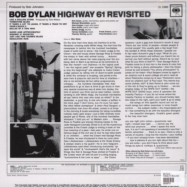 A1. Like A Rolling Stone 6:06 A2. Tombstone Blues 5:55 A3. It Takes A Lot To Laugh, It Takes A Train To Cry 4:03 A4. From A Buick 6 3:11 A5. Ballad Of A Thin Man 5:55 B1. Queen Jane Approximately 5:30 B2. Highway 61 Revisited 3:20 B3. Just Like Tom Thumb's Blues 5:26 B4. Desolation Row 11:18