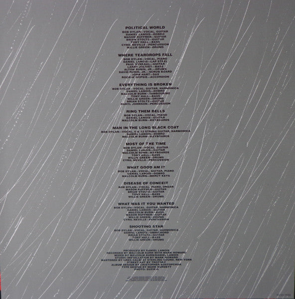 A1. Political World 3:43 A2. Where Teardrops Fall 2:30 A3. Everything Is Broken 3:12 A4. Ring Them Bells 3:00 A5. Man In The Long Black Coat 4:30 B1. Most Of The Time 5:01 B2. What Good Am I? 4:45 B3. Disease Of Conceit 3:41 B4. What Was It You Wanted 5:02 B5. Shooting Star 3:12
