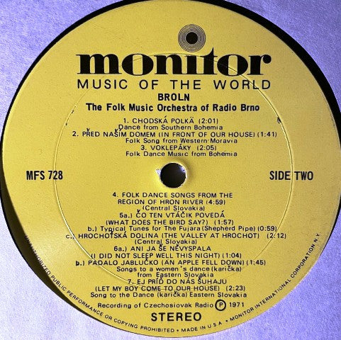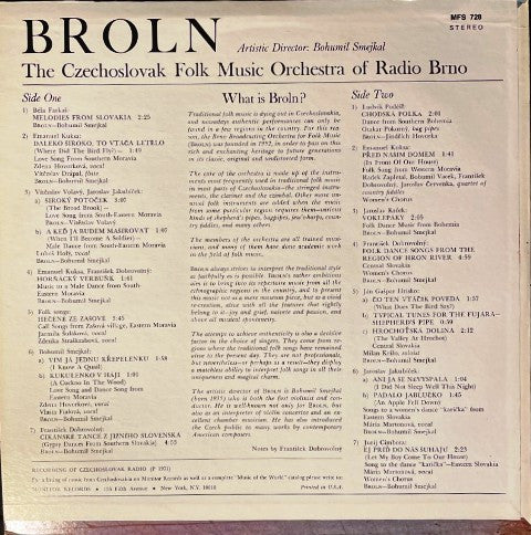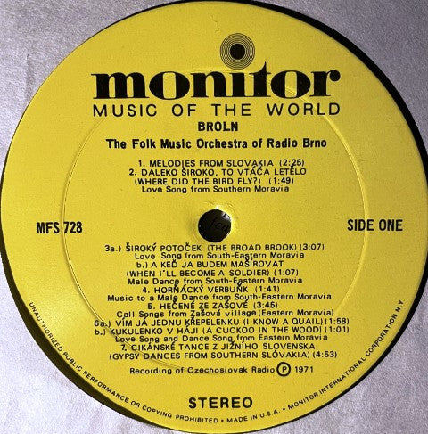 A1. Melodies From Slovakia 2:25 A2. Daleko Široko, To Vtáča Letělo (Where Did The Bird Fly?) 1:49 A3a. Široký Potoček (The Broad Brook) 3:07 A3b. A Keđ Ja Budem Mašírovat (When I'll Become A Soldier) 1:07 A4. Horňacký Verbuňk 1:41 A5. Folk Songs: Hačené Ze Zašové 3:45 A6a. Vím Já Jednu Kŕ Pelenku (I Know A Quail) 1:58 A6b. Kukulenko V Háji (A Cuckoo In The Wood) 1:01 A7. Cikánskè Tance Z Jižního Slovenska (Gypsy Dances From Southern Slovakia) 4:53 B1. Chodská Polka 2:01 B2. Před Našim Domem (In Front Of Our House) 1:41 B3. Voklepáky 2:05 B4. Folk Dance Songs From The Region Of Hron River 4:59 B5a. Čo Ten Vtáčik Povedá (What Does The Bird Say?) 1:57 B5b. Typical Tunes For The Fujara 0:59 B5c. Hrochoťská Dolina (The Valley At Hrochot) 2:12 B6a. Ani Ja Še Navyspala (I Did Not Sleep Well This Night) 1:04 B6b. Padalo Jablučko (An Apple Fell Down) 1:45 B7. Ej Priď Do Nás Šuhaju (Let My Boy Come Home To Our House) 2:23