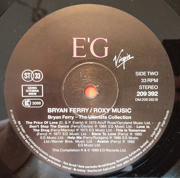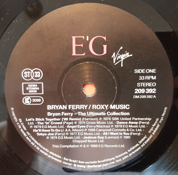 A1. Bryan Ferry - Let's Stick Together ('88 Remix) A2. Bryan Ferry - The 'In' Crowd A3. Roxy Music - Dance Away A4. Roxy Music - Angel Eyes A5. Bryan Ferry - He'll Have To Go A6. Bryan Ferry - Tokyo Joe A7. Roxy Music - All I Want Is You A8. Roxy Music - Jealous Guy B1. Bryan Ferry - The Price Of Love B2. Bryan Ferry - Don't Stop The Dance B3. Roxy Music - Love Is The Drug B4. Bryan Ferry - This Is Tomorrow B5. Bryan Ferry - Slave To Love B6. Bryan Ferry - Help Me B7. Roxy Music - Avalon