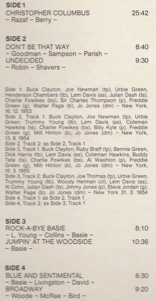 A. Christopher Columbus 25:42B1. Don't Be That Way 8:40B2. Undecided 9:30C1. Rock-A-Bye Basie 8:10C2. Jumpin' At The Woodside 10:36D1. Blue And Sentimental 6:30D2. Broadway 9:20