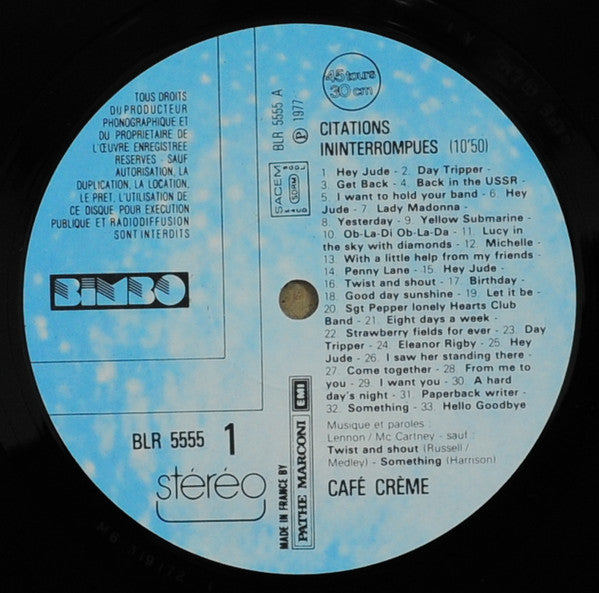 A side is a medley Of Beatles songs and is titled "Citations Ininterrompues" (P)1977 Bimbo Made in France by Pathé Marconi EMI.