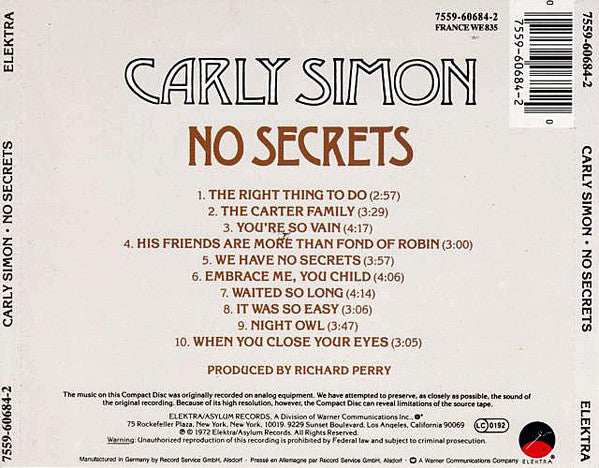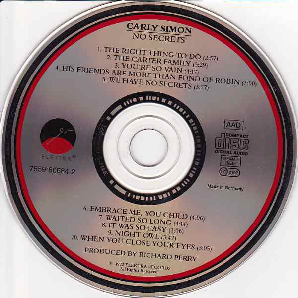 1. The Right Thing To Do 2:572. The Carter Family 3:293. You're So Vain 4:174. His Friends Are More Than Fond Of Robin 3:005. We Have No Secrets 3:576. Embrace Me, You Child 4:067. Waited So Long 4:148. It Was So Easy 3:069. Night Owl 3:4710. When You Close Your Eyes 3:05