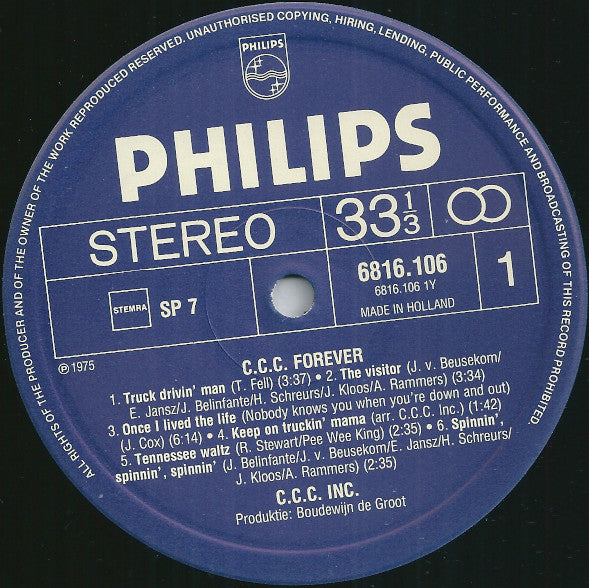 (P)1975 Catalog number on back sleeve and spine: Universe Productions SP-7 Catalog number on labels: Philips 6816.106 Recorded live at their farewell concert in the Shaffy Theater, Amsterdam on August 19, 1974. The runouts are stamped. Track A1: American Music Inc. Tracks A2, A4, A6, B4: Anagon Music Publ. Track A3: C. Williams/Publ. Co. Track A5: Acuff Rose Publ. Tracks B1, B2: No publisher mentioned Tracks B3, B5: New Dayglow The tracks are on the cover numbered from 1 to 11.