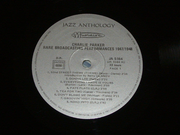 A1. 52nd Street Theme (Theme) + Intro 2:15 A2. Donna Lee 2:22 A3. Everything I Have Is Yours 3:05 A4. Fats Flats 2:55 A5. Tea For Two 2:34 A6. Don't Blame Me 3:11 A7. Groovin' High 3:35 A8. Koko Into 5:41 B1. Ornithology 5:35 B2. Cheryl 5:07 B3. Koko 5:12 B4. Bird Of Paradise 5:18