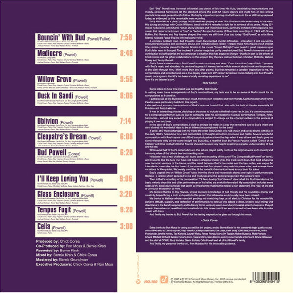 A1. Bouncin' With Bud 7:58 A2. Mediocre 8:48 B1. Willow Grove 9:56 B2. Dusk In Sandi 8:06 C1. Oblivion 7:14 C2. Cleopatra's Dream * 6:08 C3. Bud Powell 6:20 D1. I'll Keep Loving You 9:06 D2. Glass Enclosure 3:20 D3. Tempus Fugit 9:28 D4. Celia 3:00