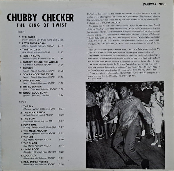 A1. The Twist 2:32 A2. Let's Twist Again 2:16 A3. Twistin' U.S.A. 2:30 A4. Twist-A-Long 2:36 A5. Twistin' Round The World 2:34 A6. Twistin' 2:08 A7. Don't Knock The Twist 2:17 A8. Dance-A-Long 2:36 A9. Oh, Susannah 2:30 A10. Good, Good Lovin' 2:24 B1. The Fly 2:27 B2. The Hucklebuck 2:30 B3. The Slop 2:07 B4. Pony Time 2:27 B5. The Mess Around 2:22 B6. The Jet 2:00 B7. The Class 2:13 B8. Limbo Rock 2:22 B9. Loddy Lo 2:07 B10. Hey, Bobba Needle 2:16