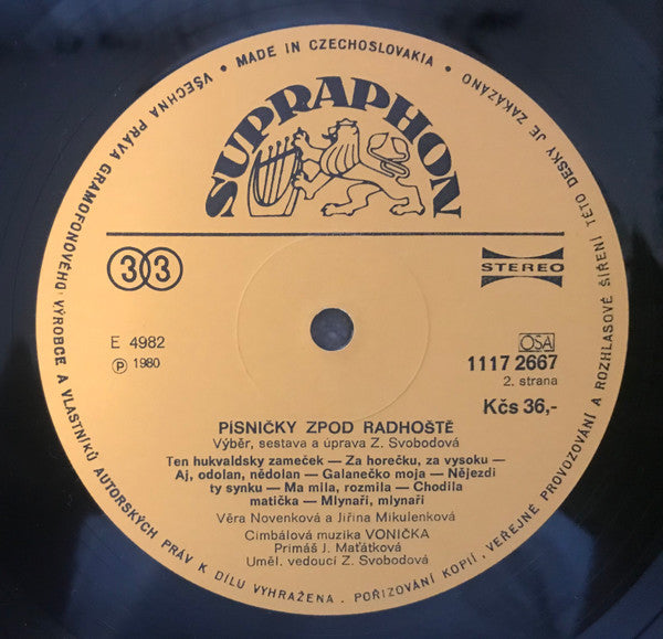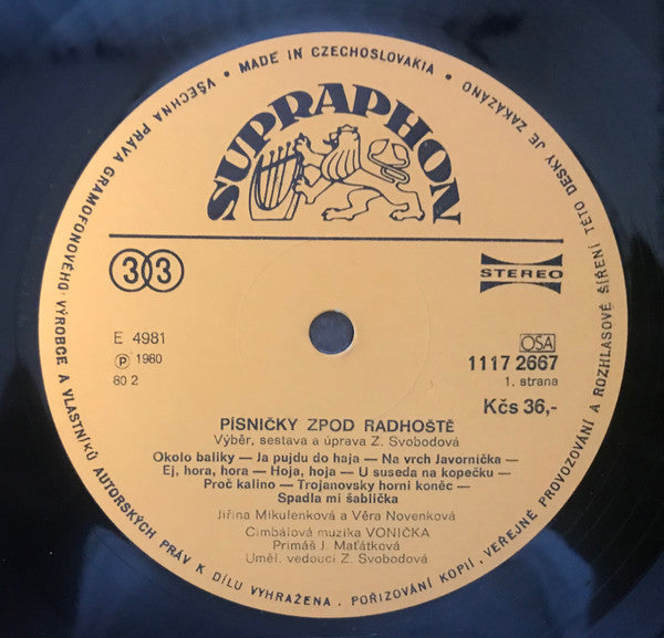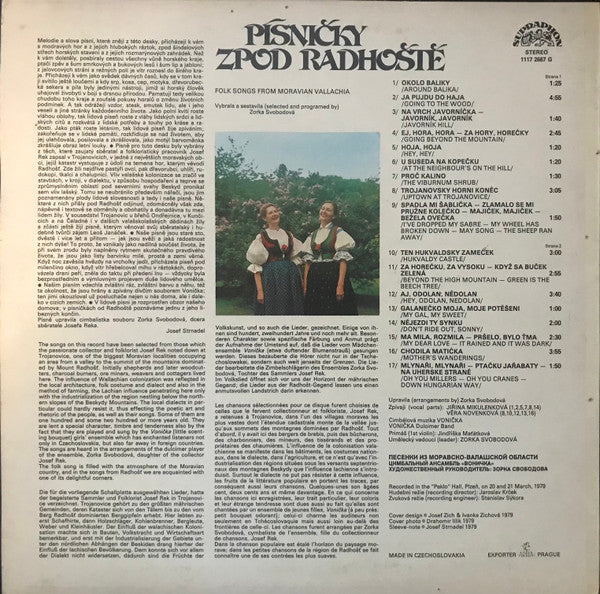 A1. Okolo Baliky = Around Balika 1:25 A2. Ja Pujdu Do Haja = Going To The Wood 4:55 A3. Na Vrch Javorníčka / Javorník, Javorník = Javorník Hill 1:40 A4. Ej, Hora, Hora / Za Hory, Horečky = Going Beyond The Mountain 2:45 A5. Hoja, Hoja = Hey, Hey 1:20 A6. U Suseda Na Kopečku = At The Neighbour's On The Hill 1:20 A7. Proč Kalino = The Viburnum Shrub 1:30 A8. Trojanovsky Horni Koněc = Uptown At Trojanovice 3:05 A9. Spadla Mi Šablička = I've Dropped My Sabre / Zlamalo Se Mi Pružne Kolečko = My Wheel has Broken Down / Majiček, Majiček = May Song / Bežela Ovečka = The Sheep Ran Away 1:50 B1. Ten Hukvaldsky Zameček = Hukvaldy Castle 3:00 B2. Za Horečku, Za Vysoku = Beyond The High Mountain / Když Sa Buček Zelená = Green Is The Beech Tree 2:55 B3. Aj, Odolan, Nědolan = Hey, Odolan, Nedolan 3:40 B4. Galanečko Moja, Moje Potěšeni = My Gal, My Sweet 1:00 B5. Nějezdi Ty Synku = Don't Ride Out, Sonny 2:00 B6. Ma Mila, Rozmila = My Dear Love / Pršelo, Bylo Ťma = It Rained And It Was Dark 2:30 B7. Chodila Matička = Mother's Wanderings 3:55 B8. Mlynaři, Mlynaři = Oh My Millers / Ptačku Jařabaty = Oh You Cranes / Na Uherske Straně = Down Hungarian Way 1:50