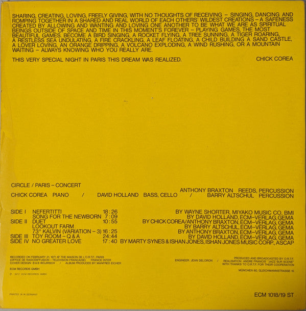 A1. Nefertitti 18:26 A2. Song For The Newborn 7:09 B1. Duet 10:55 B2. Lookout Farm / 73° Kalvin (Variation - 3) 16:25 C. Toy Room - Q & A 24:44 D. No Greater Love 17:40