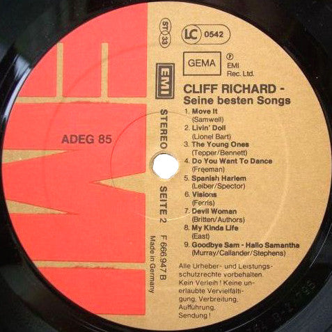 A1. We Don't Talk Anymore A2. Carrie A3. The Day I Met Marie A4. Lucky Lips A5. Travelin' Light A6. Blue Turns To Grey A7. I Could Easily Fall (In Love With You) A8. Bachelor Boy A9. Miss You Nights B1. Move It B2. Livin' Doll B3. The Young Ones B4. Do You Want To Dance B5. Spanish Harlem B6. Visions B7. Devil Woman B8. My Kinda Life B9. Goodbye Sam - Hallo Samantha