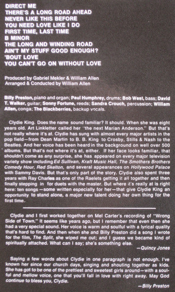 A1. Direct Me 2:25 A2. Ain't My Stuff Good Enough 2:41 A3. First Time, Last Time 2:14 A4. Never Like This Before 2:48 A5. I Can't Go On Without Love 3:20 B1. 'Bout Love 2:57 B2. Long Road Ahead 3:00 B3. B Minor 2:28 B4. You Need Love Like I Do, Don't You 3:12 B5. The Long And Winding Road 3:24