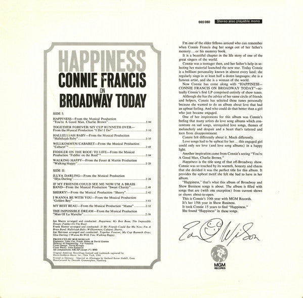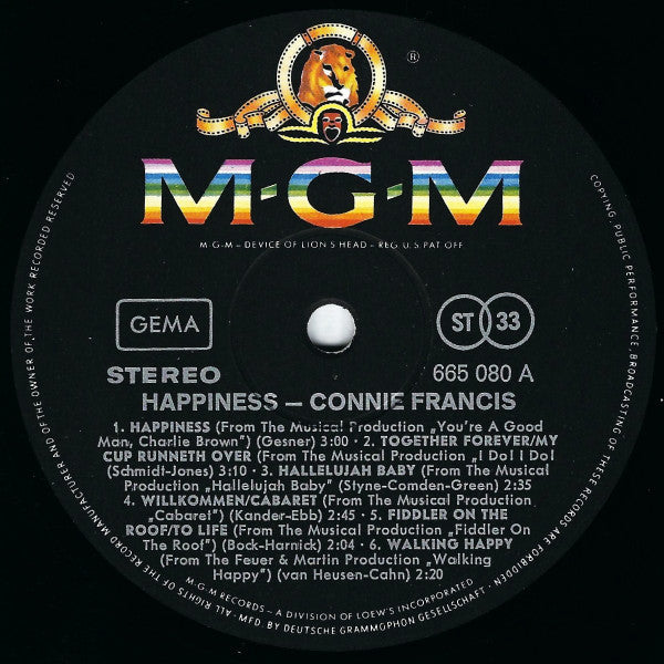 A1. Happiness 3:00 A2. Together Forever/My Cup Runneth Over 3:10 A3. Hallelujah Baby 2:35 A4. Willkommen/Cabaret 2:45 A5. Fiddler On The Roof/To Life 2:04 A6. Walking Happy 2:20 B1. Illya Darling 2:26 B2. If My Friends Could See Me Now/I'm A Brass Band 2:48 B3. Sherry 2:42 B4. I Wanna Be With You 3:03 B5. My Best Beau 2:32 B6. The Impossible Dream 2:58