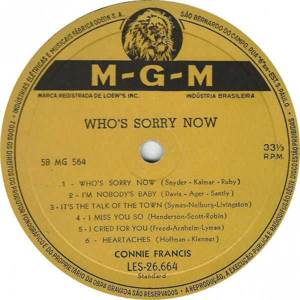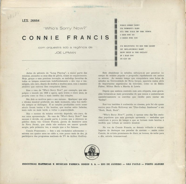 The sleeve to the this release features the picture of a girl that is not Connie Francis. A rare Odeon release, the jacket lists only 10 of the 12 titles contained. These 10, in fact, are the same selections to be found on the British 10" LP on MGM D 153 as issued by the parent EMI company in that country.