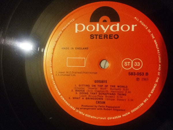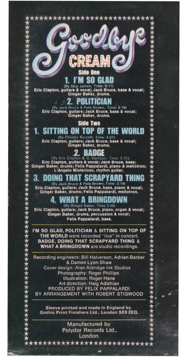 A1. I'm So Glad 9:11 A2. Politician 6:19 B1. Sitting On Top Of The World 5:01 B2. Badge 2:45 B3. Doing That Scrapyard Thing 3:14 B4. What A Bringdown 3:56