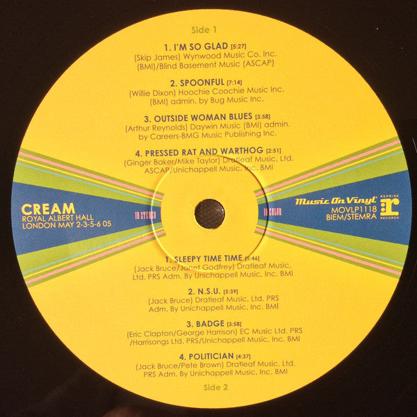 A1. I'm So Glad 5:27 A2. Spoonful 7:14 A3. Outside Woman Blues 3:58 A4. Pressed Rat & Warthog 2:51 B1. Sleepy Time Time 5:46 B2. N.S.U. 5:39 B3. Badge 3:58 B4. Politician 4:37 C1. Sweet Wine 6:07 C2. Rollin' And Tumblin' 5:46 C3. Stormy Monday 7:33 D1. Deserted Cities Of The Heart 3:40 D2. Born Under A Bad Sign 5:11 D3. We're Going Wrong 7:48 E1. Crossroads 3:53 E2. White Room 5:27 E3. Toad 9:47 F1. Sunshine Of Your Love 8:05 F2. Sleepy Time Time (Alternate) 5:48
