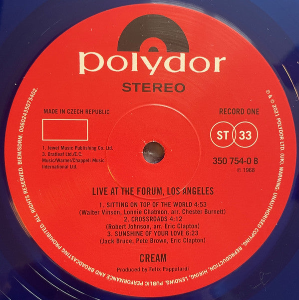 A1. Introduction By Buddy Miles 1:40 A2. White Room 6:30 A3. Politician 6:45 A4. I'm So Glad 9:31 B1. Sitting On Top Of The World 4:53 B2. Crossroads 4:12 B3. Sunshine Of Your Love 6:23 C1. Traintime 7:45 C2. Toad 12:55 D. Spoonful 17:27