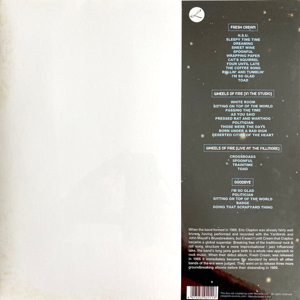 A1. N.S.U. A2. Sleepy Time Time A3. Dreaming A4. Sweet Wine A5. Spoonful A6. Wrapping Paper B1. Cat's Squirrel B2. Four Until Late B3. The Coffee Song B4. Rollin' And Tumblin' B5. I'm So Glad B6. Toad . Wheels Of Fire (In The Studio) C1. White Room C2. Sitting On Top Of The World C3. Passing The Time C4. As You Said D1. Pressed Rat And Warthog D2. Politician D3. Those Were The Days D4. Born Under A Bad Sign D5. Deserted Cities Of The Heart . Wheels Of Fire (Live At The Filmore) E1. Crossroads E2. Spoonful F1. Traintime F2. Toad . Goodbye G1. I'm So Glad G2. Politician G3. Sitting On Top Of The World H1. Badge H2. Doing That Scrapyard Thing H3. What A Bringdown