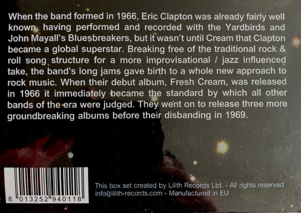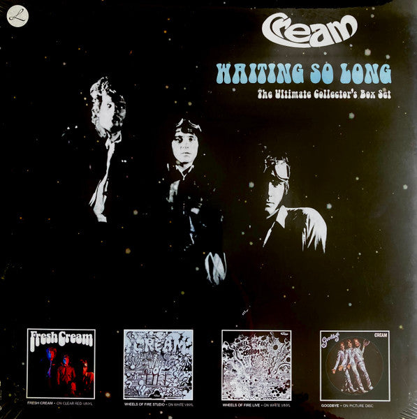 Fresh Cream on clear red vinyl, Wheels of Fire (studio) on white vinyl and Wheels of Fire (Live) on white vinyl and Goodbye on picture disc.