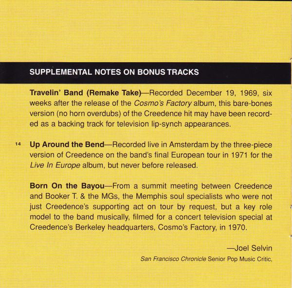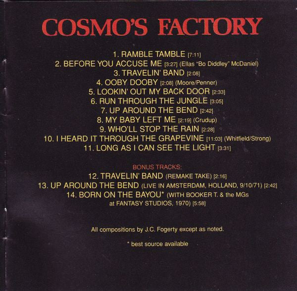 1. Creedence Clearwater Revival - Ramble Tamble 7:112. Creedence Clearwater Revival - Before You Accuse Me 3:273. Creedence Clearwater Revival - Travelin' Band 2:084. Creedence Clearwater Revival - Ooby Dooby 2:085. Creedence Clearwater Revival - Lookin' Out My Back Door 2:336. Creedence Clearwater Revival - Run Through The Jungle 3:057. Creedence Clearwater Revival - Up Around The Bend 2:428. Creedence Clearwater Revival - My Baby Left Me 2:199. Creedence Clearwater Revival - Who'll Stop The Rain 2:2810. Creedence Clearwater Revival - I Heard It Through The Grapevine 11:0311. Creedence Clearwater Revival - Long As I Can See The Light 3:31. Bonus Tracks 12. Creedence Clearwater Revival - Travelin' Band (Remake Take) 2:1613. Creedence Clearwater Revival - Up Around The Bend (Live In Amsterdam, Holland, 9/10/71) 2:4214. Creedence Clearwater Revival, Booker T & The MG's - Born On The Bayou (With Booker T. & The MGs At Fantasy Studios, 1970) 5:58