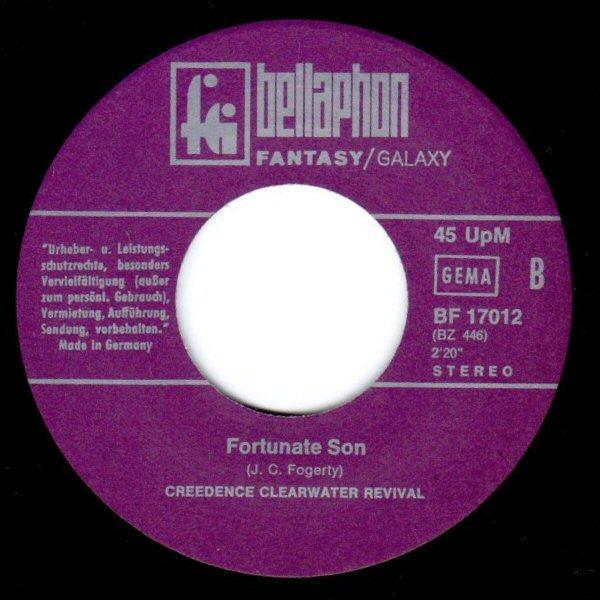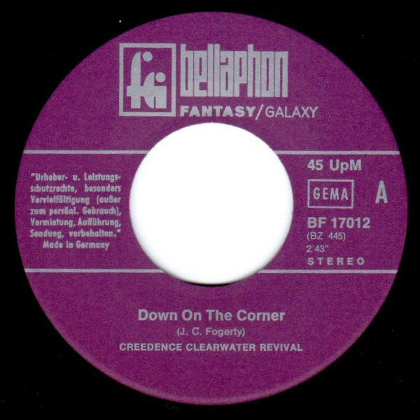 German release with "A" and "B" on labels. Both german releases changed the sides. Identified on the lower matrix number BZ 445 on the "Down On The Corner" side. The cover stated "Fortunate Son" as the A side and "Down On The Corner" on side B