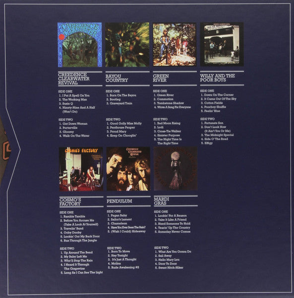 A1. I Put A Spell On You 4:25 A2. The Working Man 3:02 A3. Susie Q 8:34 B1. Ninety-Nine And A Half (Won't Do) 3:35 B2. Get Down Woman 3:02 B3. Porterville 2:13 B4. Gloomy 3:48 B5. Walk On The Water 4:16 . Bayou Country C1. Born On The Bayou 5:16 C2. Bootleg 3:02 C3. Graveyard Train 8:38 D1. Good Golly Miss Molly 2:44 D2. Penthouse Pauper 3:40 D3. Proud Mary 3:09 D4. Keep On Chooglin' 7:40 . Green River E1. Green River 2:32 E2. Commotion 2:41 E3. Tombstone Shadow 3:36 E4. Wrote A Song For Everyone 4:55 F1. Bad Moon Rising 2:18 F2. Lodi 3:10 F3. Cross-Tie Walker 3:17 F4. Sinister Purpose 3:20 F5. The Night Time Is The Right Time 3:07 . Willy And The Poor Boys G1. Down On The Corner 2:43 G2. It Came Out Of The Sky 2:58 G3. Cotton Fields 2:53 G4. Poorboy Shuffle 2:25 G5. Feelin' Blue 5:05 H1. Fortunate Son 2:20 H2. Don't Look Now (It Ain't You Or Me) 2:08 H3. The Midnight Special 4:10 H4. Side O' The Road 3:21 H5. Effigy 6:28 . Cosmos Factory I1. Ramble Tamble 7:09 I2. Before You Accuse Me (Take A Look At Yourself) 3:24 I3. Travelin' Band 2:07 I4. Ooby Dooby 2:05 I5. Lookin' Out My Back Door 2:31 I6. Run Through The Jungle 3:09 J1. Up Around The Bend 2:40 J2. My Baby Left Me 2:17 J3. Who'll Stop The Rain 2:28 J4. I Heard It Through The Grapevine 11:05 J5. Long As I Can See The Light 3:33 . Pendulum K1. Pagan Baby 6:25 K2. Sailor's Lament 3:52 K3. Chameleon 3:20 K4. Have You Ever Seen The Rain 2:38 K5. (Wish I Could) Hideaway 3:49 L1. Born To Move 5:39 L2. Hey Tonight 2:43 L3. It's Just A Thought 3:56 L4. Molina 2:41 L5. Rude Awakening #2 6:19 . Mardi Gras M1. Lookin' For A Reason 3:25 M2. Take It Like A Friend 3:01 M3. Need Someone To Hold 2:59 M4. Tearin' Up The Country 2:13 M5. Someday Never Comes 3:59 N1. What Are You Gonna Do 2:51 N2. Sail Away 2:25 N3. Hello Mary Lou 2:11 N4. Door To Door 2:03 N5. Sweet Hitch-Hiker 2:59