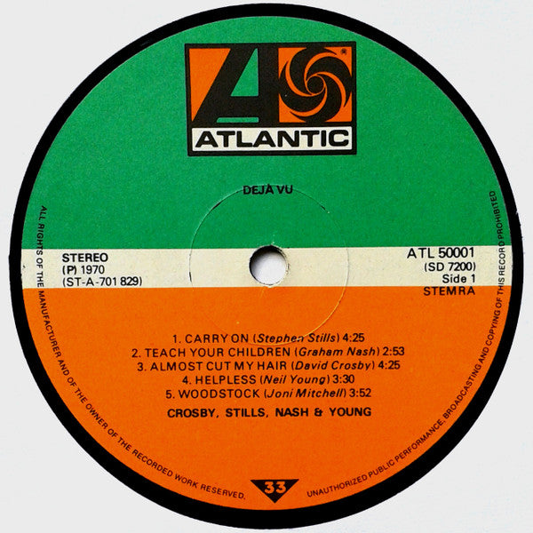 A1. Carry On 4:25 A2. Teach Your Children 2:53 A3. Almost Cut My Hair 4:25 A4. Helpless 3:30 A5. Woodstock 3:52 B1. Déjà Vu 4:10 B2. Our House 2:59 B3. 4 + 20 1:55 B4. Country Girl 5:05 B4a. Whiskey Boot Hill B4b. Down, Down, Down B4c. Country Girl, (I Think You're Pretty) B5. Everybody I Love You 2:20